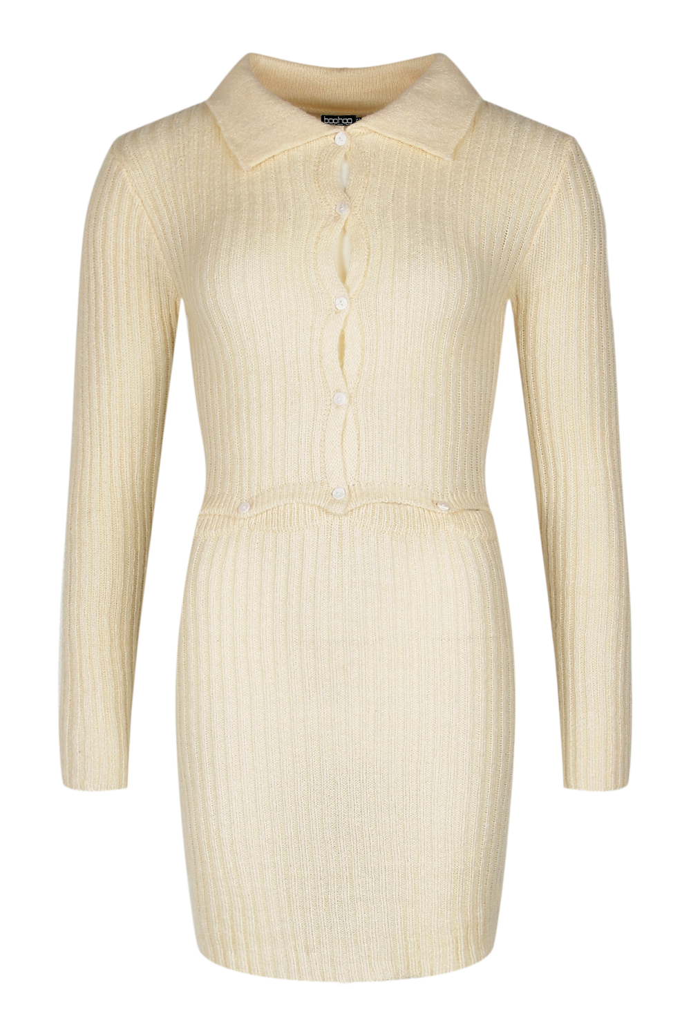 Cream Ribbed Knit Button Front Midi Polo Dress New Look
